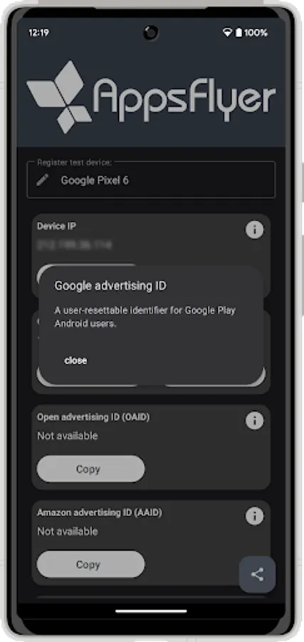 For more information about using a test device: https://support.appsflyer.com/hc/en-us/articles/207031996-Registering-test-devices