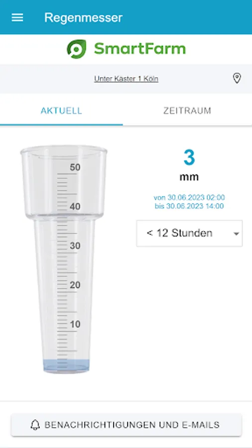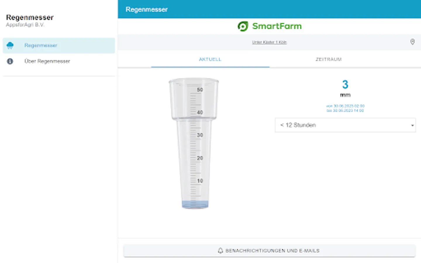 The rain gauge app gives you an up-to-date insight into the precipitation per 3 hours. The data is presented in an interactive rain glass. You can opt for the following time periods: 3h, 6h, 12h, and 24h.