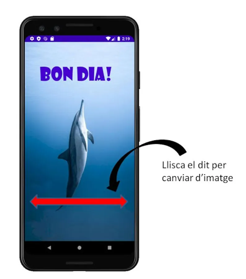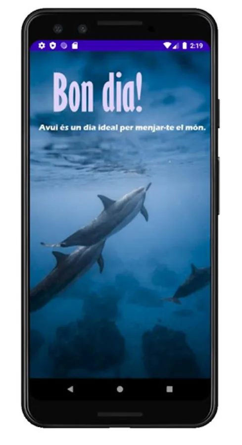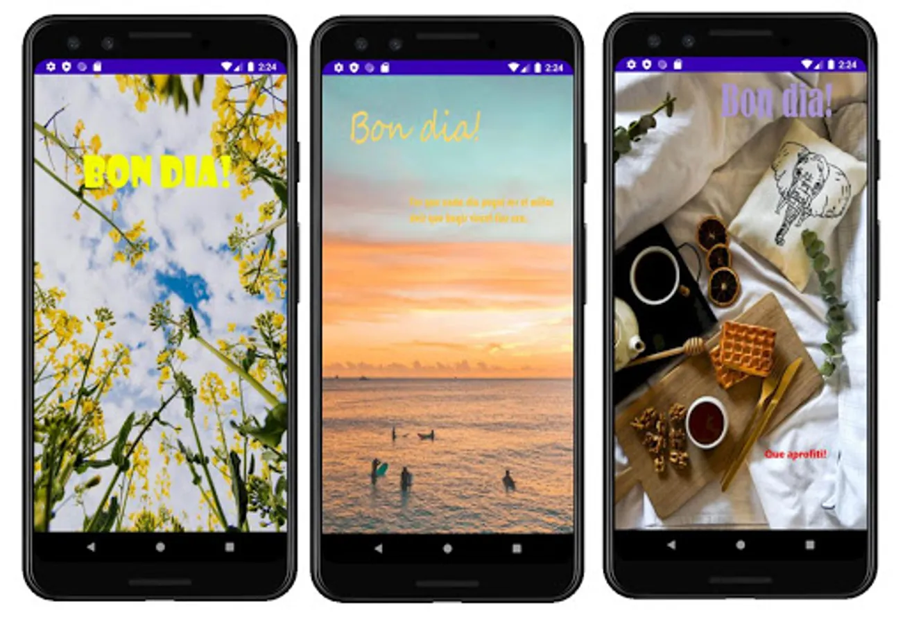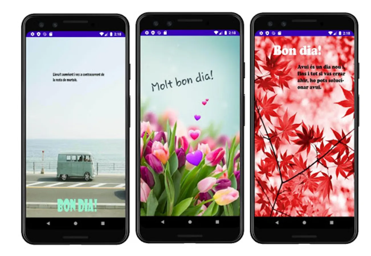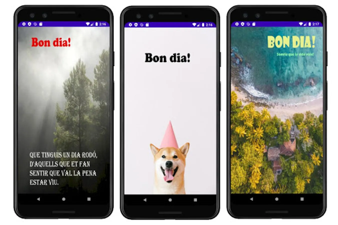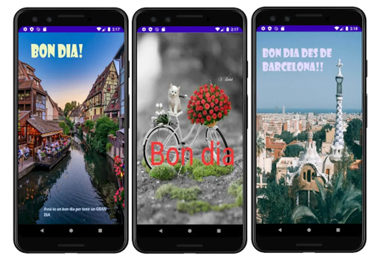 Each time you open the app, the first image will be different. This way you can quickly select a new image and phrase good morning in Catalan to share with your contacts.