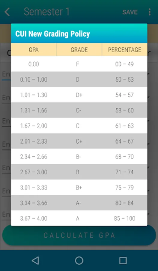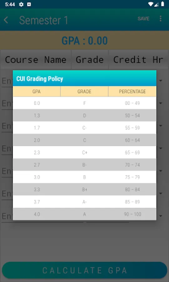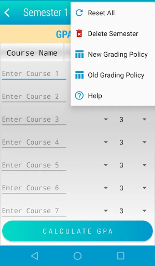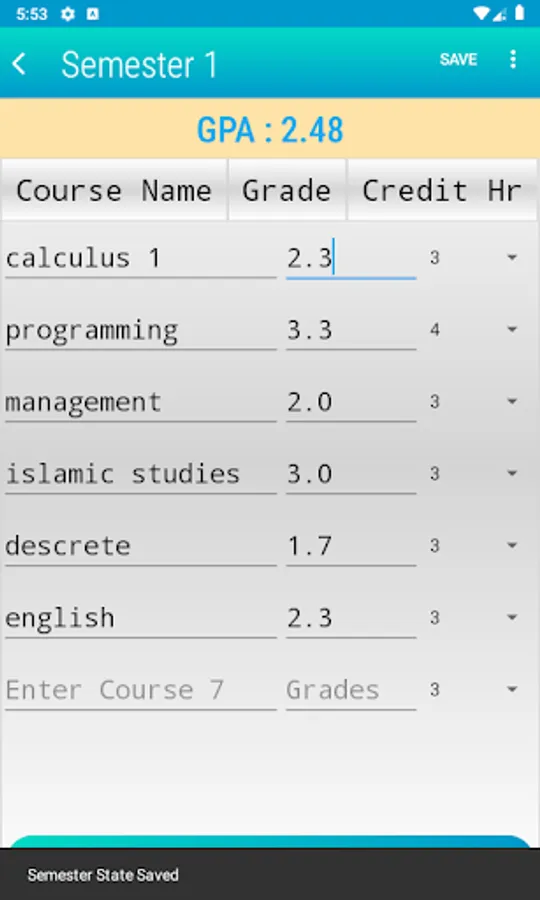 1. Save course with Name or Grades and Credit hours in their respective Semester.