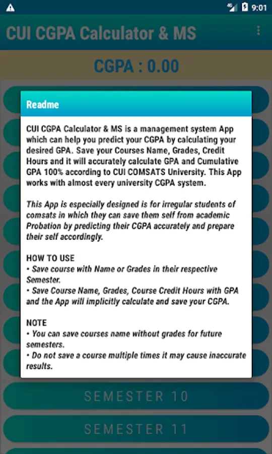 This App is especially designed is for students who are studying in irregular mode at comsats, with the help of this App they can prevent from academic Probation by predicting their CGPA accurately and study accordingly.