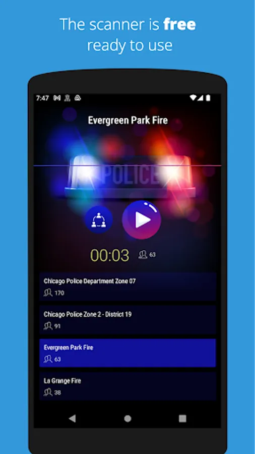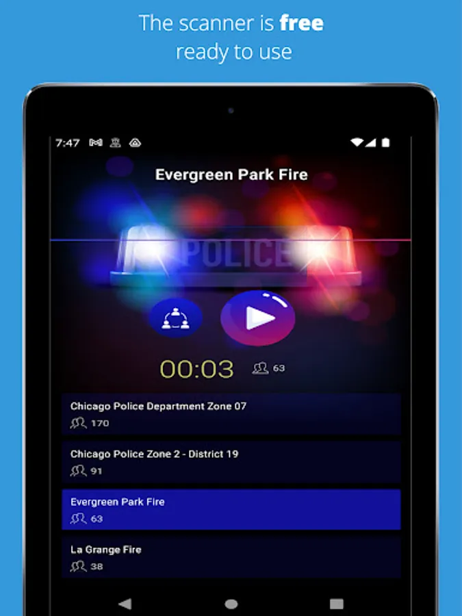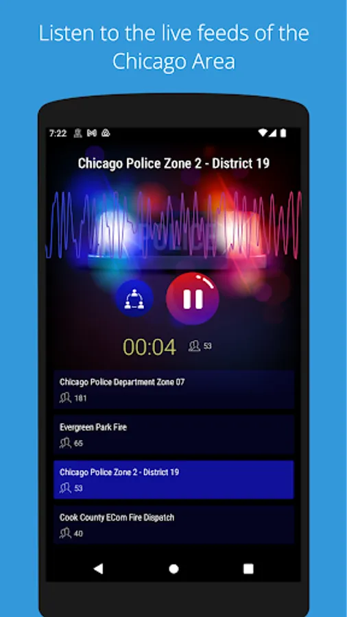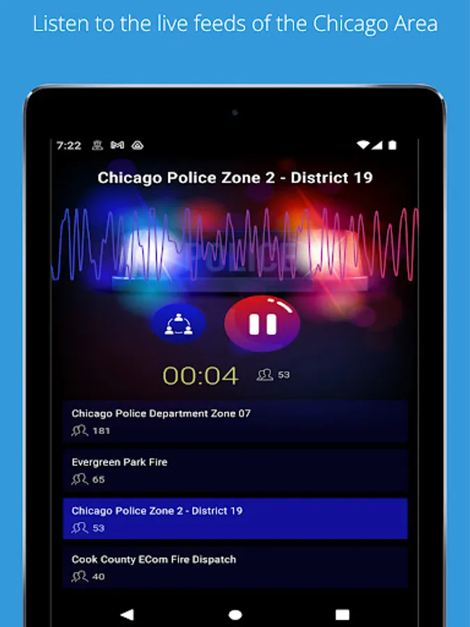 Listen to the live feeds of the Chicago Area. Play, pause anytime.