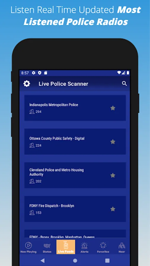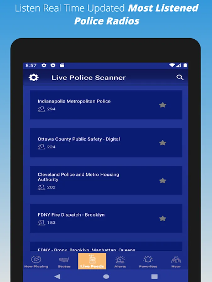 50 most listened Police Scanner Radio channels changing dynamically with listener numbers.