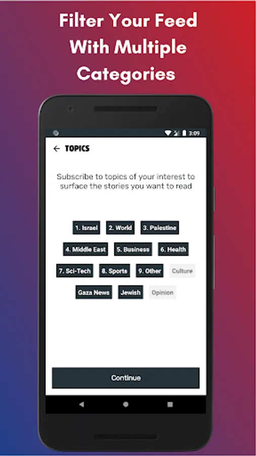 News in twelve different categories : Israel, World, Middle East, Gaza, Jewish News, Culture, Sci/Tech, Business, Entertainment, Sports, Opinion and Health. You can turnoff the categories you don't like using the news filter.