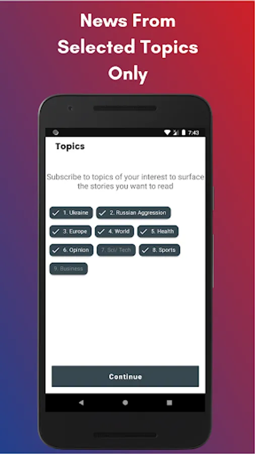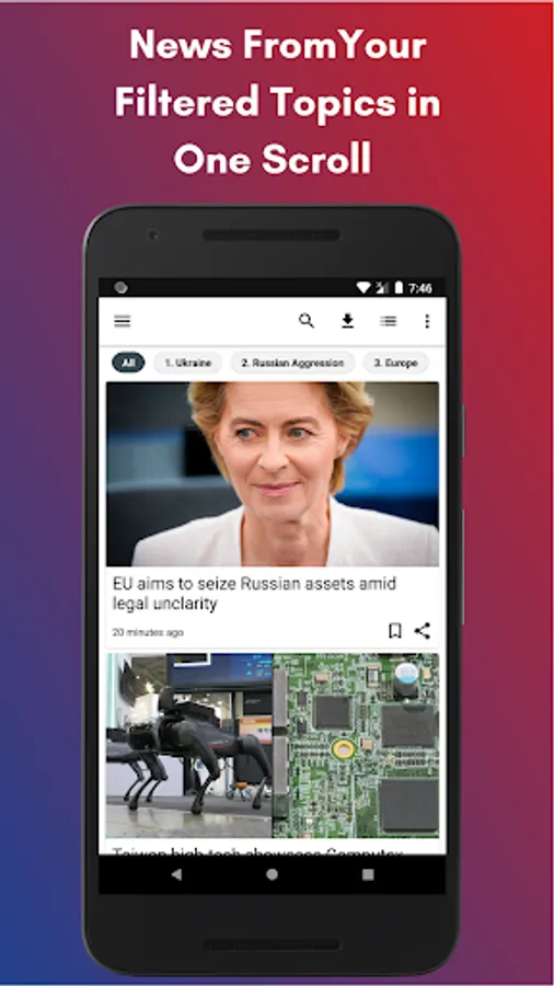 News in ten different categories : Ukraine, Europe, Russian Aggression, World, Business, Entertainment, Sports, Opinion and Sci/Tech. You can turnoff the categories you don't like using the news filter.