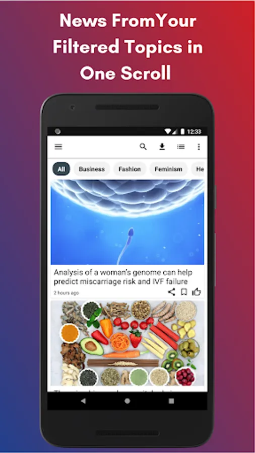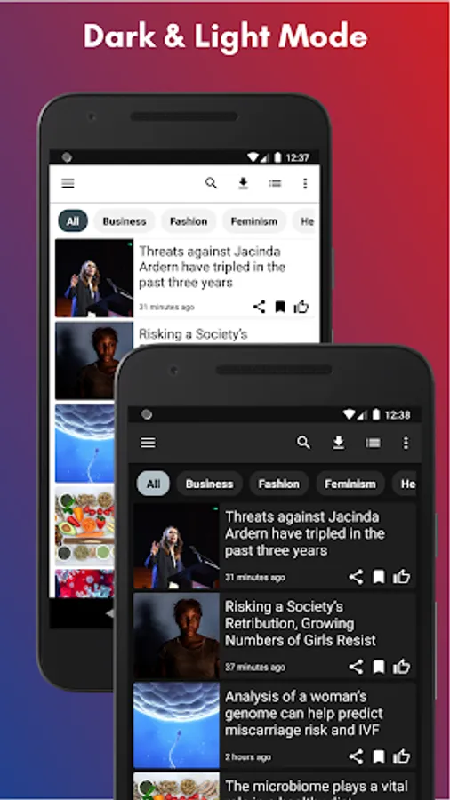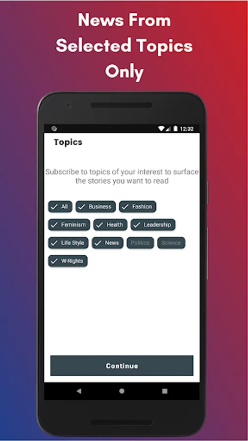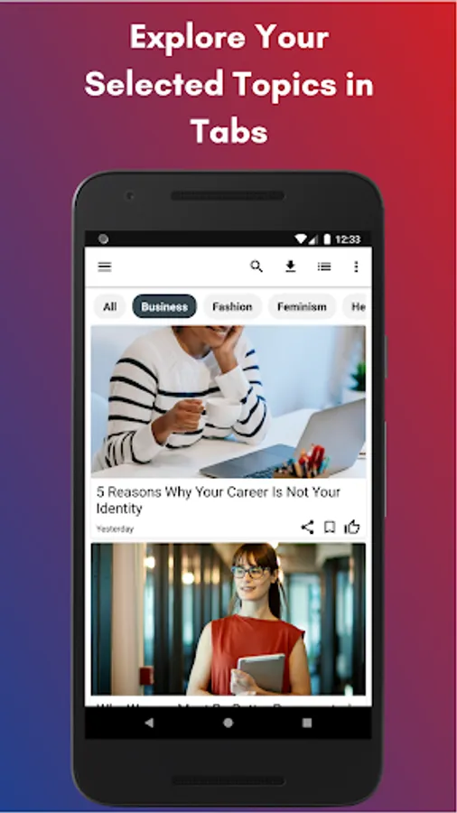 News in ten different categories : News, Business, Fashion, Feminism, Health, Leadership, Lifestyle, Politics, Science & Women Rights. You can turnoff the categories you don't like using the news filter.