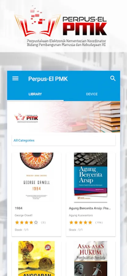 El-PMK Library is a digital library owned by the Coordinating Ministry for Human Development and Culture (Kemenko PMK) which is currently only accessible to employees within the Coordinating Ministry for Human Development and Culture. There are hundreds of digital book collections that can be enjoyed just by touching the screen of your gadget. Now, reading books can be accessed anywhere and anytime.