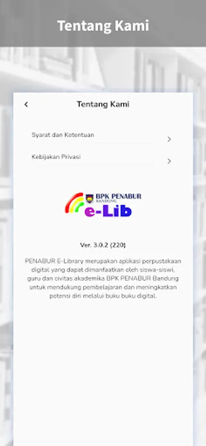 PENABUR E-Library adalah aplikasi perpustakaan digital yang dapat dimanfaatkan oleh siswa-siswi, guru dan civitas akademika BPK PENABUR Bandung untuk mendukung pembelajaran dan meningkatkan potensi diri melalui buku buku digital.