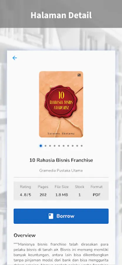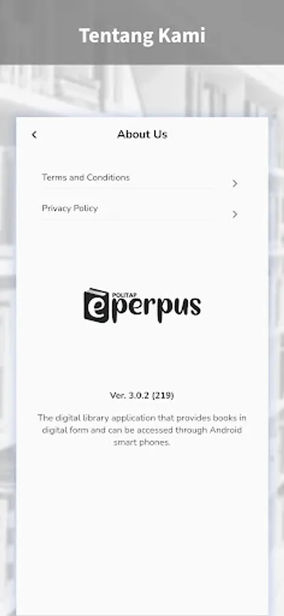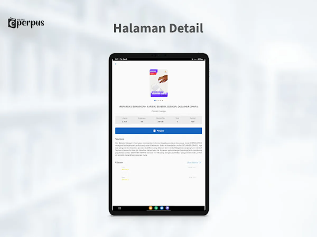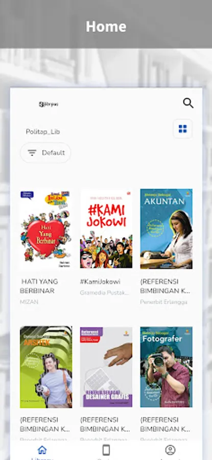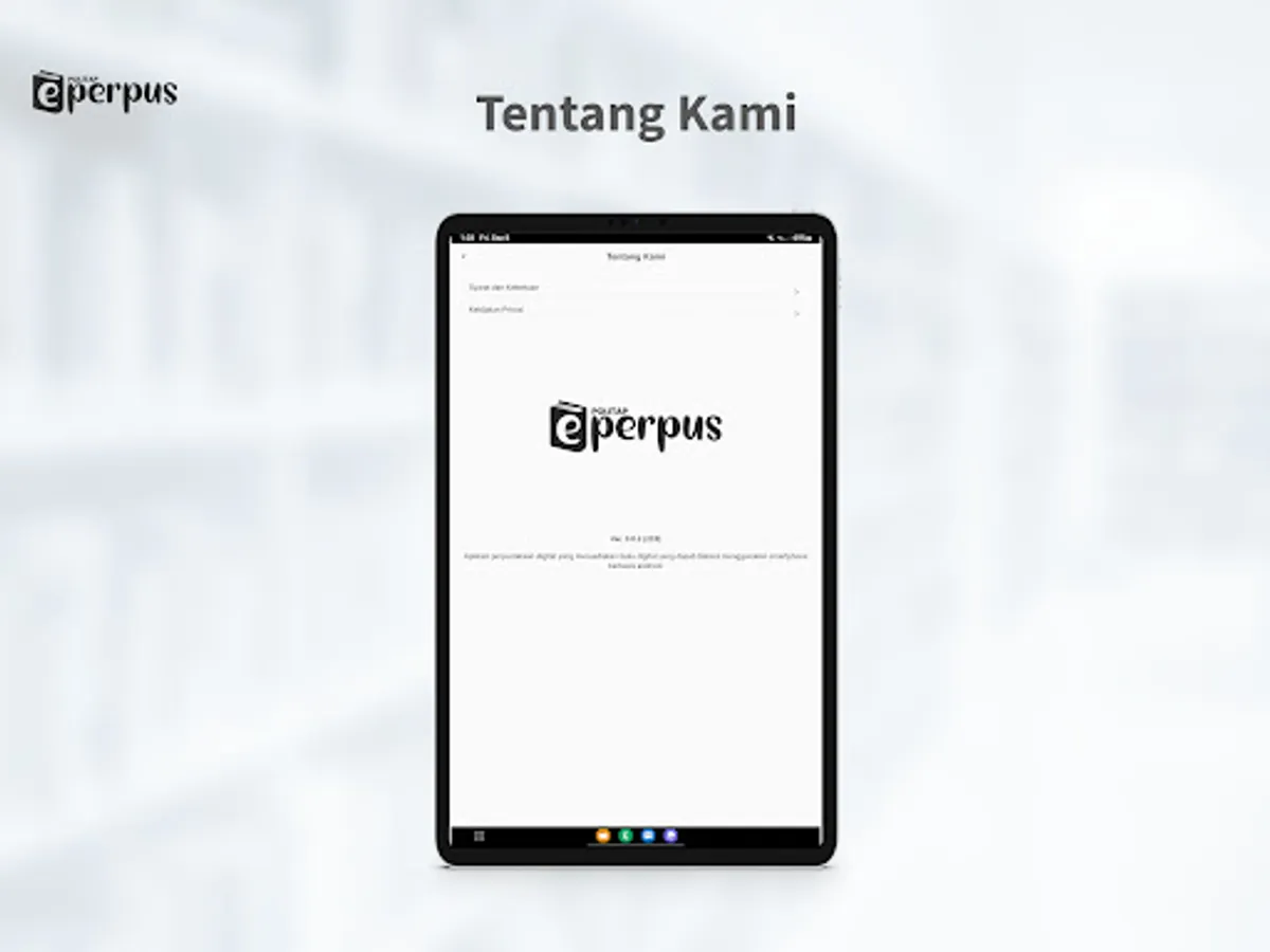 The e-library is a digital library application that provides books in digital form and can be accessed through Android smart phones and tablets. Members of the electronic library may download and borrow available books. Thousands of books from publisher of the Kompas Gramedia group and other publisher selected by librarians in order to be able to adapt the needs of members.