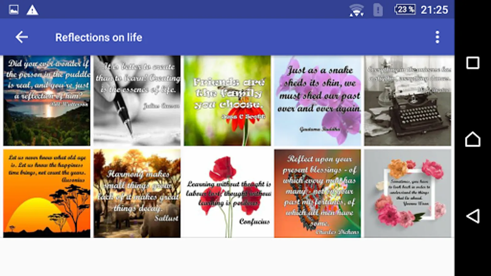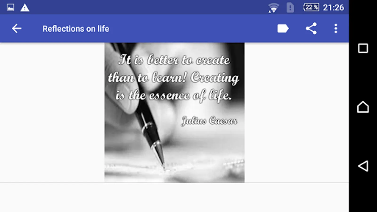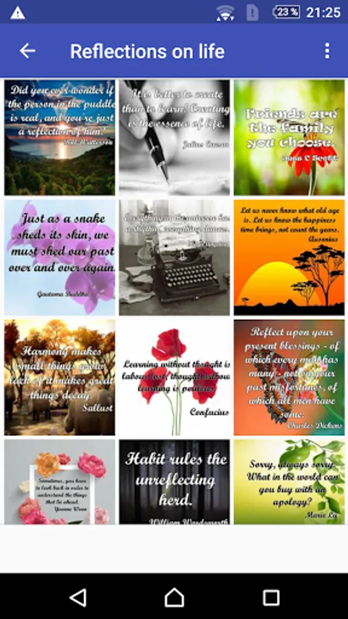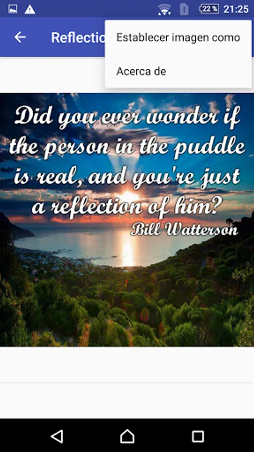 existential inquiries concerning the essence of existence, life's purpose, and the wisdom gained from life's journey. These reflections can encompass a wide spectrum of subjects, spanning from personal growth and relationships to more encompassing societal and existential inquiries. In essence, "reflections on life" represent a profound and contemplative exploration of the human experience.Are you looking for reflections for your day to day? Are you looking for a solution to your problems? Do you want to remember someone who can fight to get ahead always and with everything? Do you consider yourself a resilient person? Then downloading this app interests you.