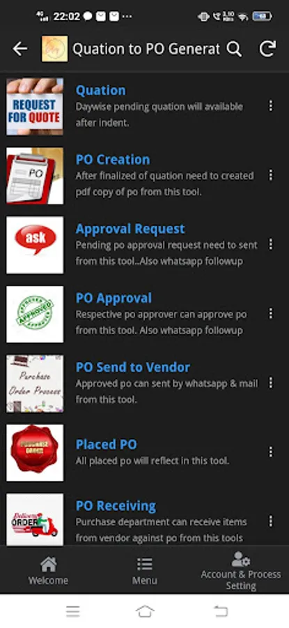 Purchase Management:- After Indent items will come in this tool & you need to follow quation to po receiving steps. Under this tool eight sub tools are available:-