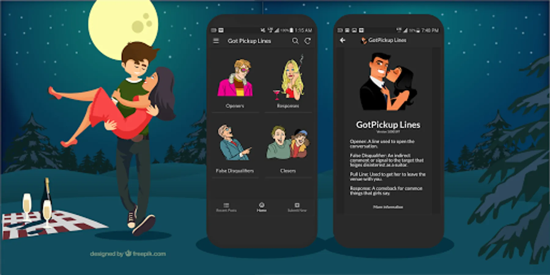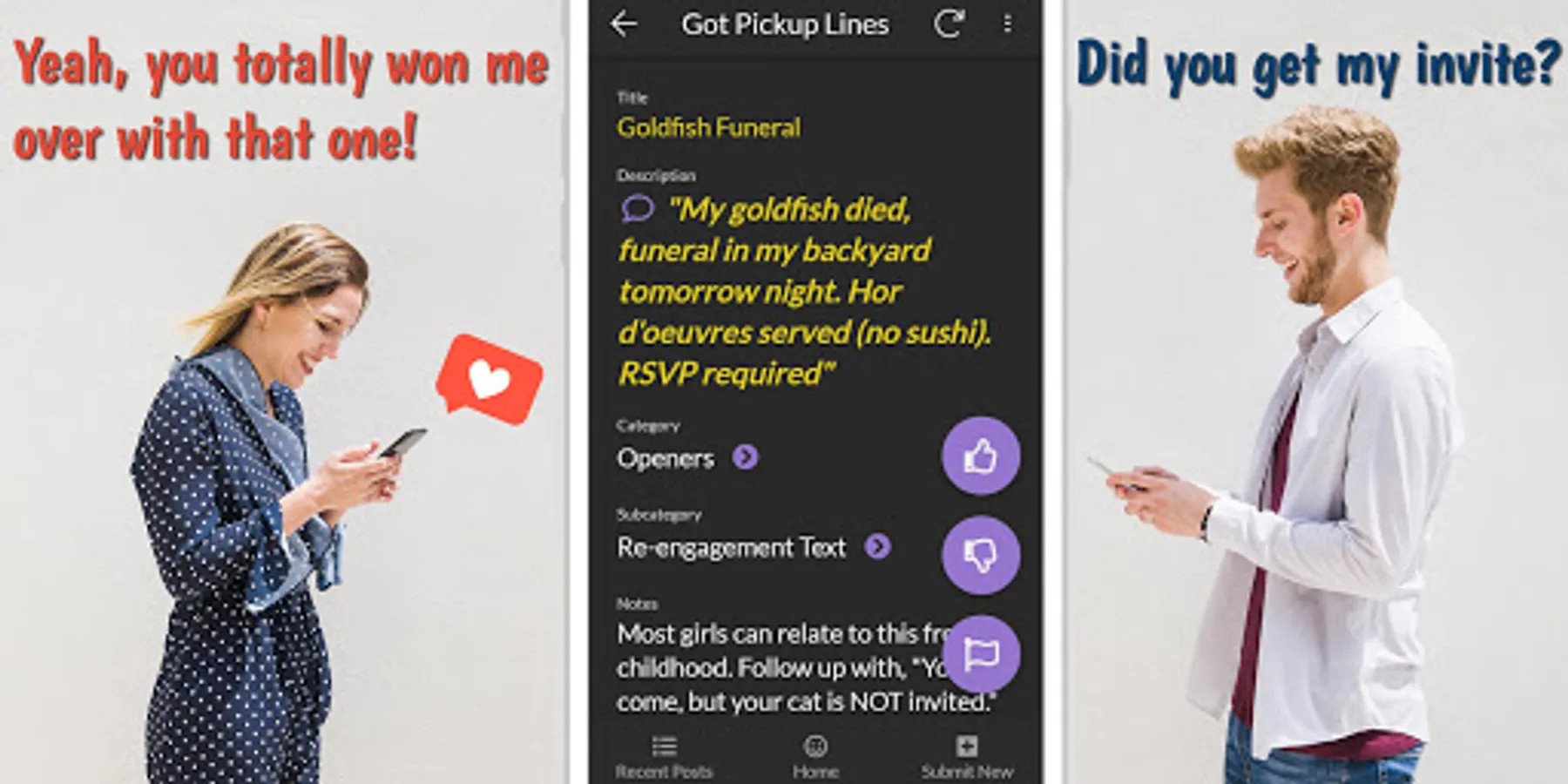 User generated content consists of line submissions, comments and effectiveness ratings. The perfect social interaction tool to flirt infield, on text messages or online with dating apps like Tinder, Bumble, Hinge, Plenty of Fish, OK Cupid, Coffee Meets Bagel etc.