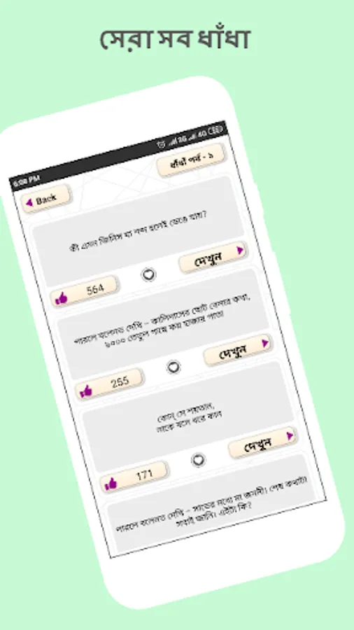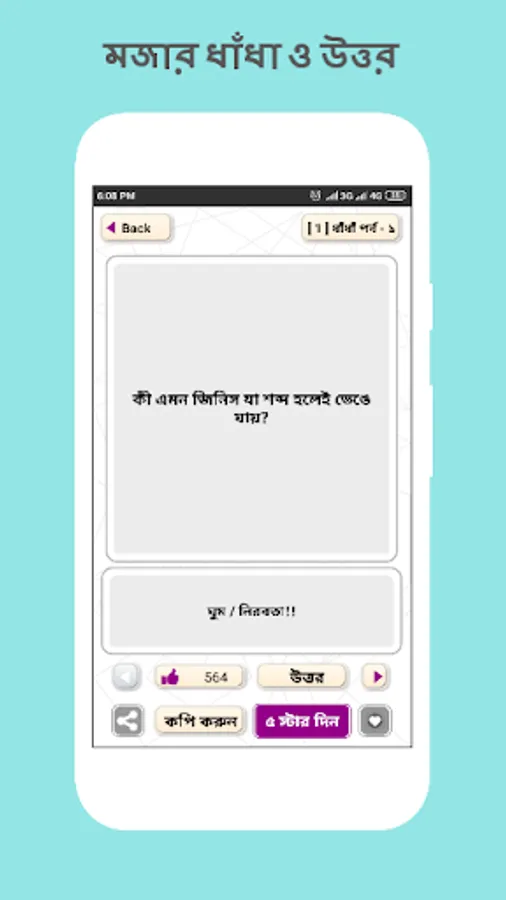 মজার ধাঁধা ও উত্তর জানা থাকলে বন্ধুদের সাথে ধাধার আসর জমিয়ে তোলা যায় খুব সহজেই। ধাঁধা প্রশ্ন ও উত্তর জানতে আমাদের এই ধাঁধার অ্যাপস টি আপনাদের ভালো লাগবে আশাকরি। বাজারর থেকে ধাধার বই dhadhar boi কিনে প্রশ্নের ধাঁধা সমাধান করার চাইতে ধাঁধা প্রশ্ন ও উত্তর একই সাথে পাবেন এই অ্যাপটিতে।