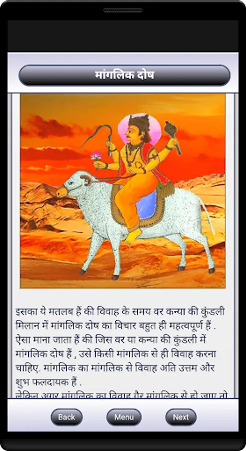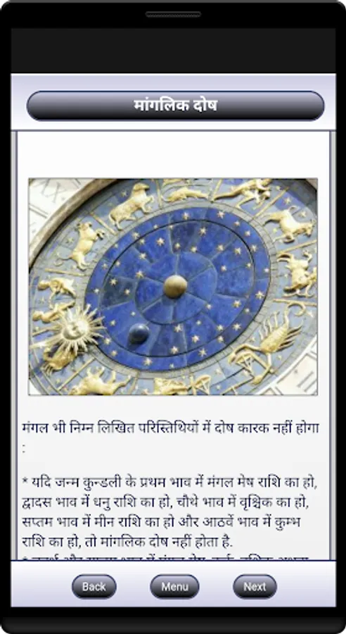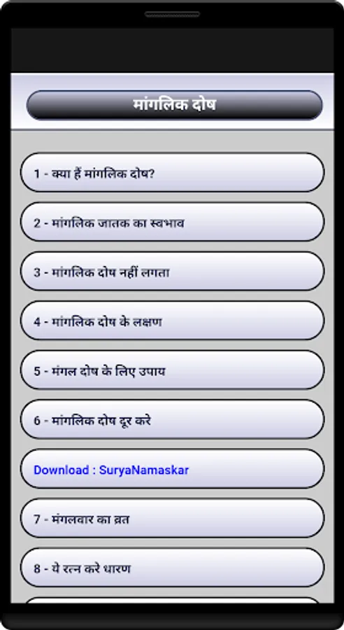 This app deals with all the theories related to astrological facts and myths surrounding Mangal dosh or Mangalik dosh. There are lots of puja vidhi for mangal shanti and their are some totaka (totake) to reduce the impact of Mangal and Mangalik dosh.