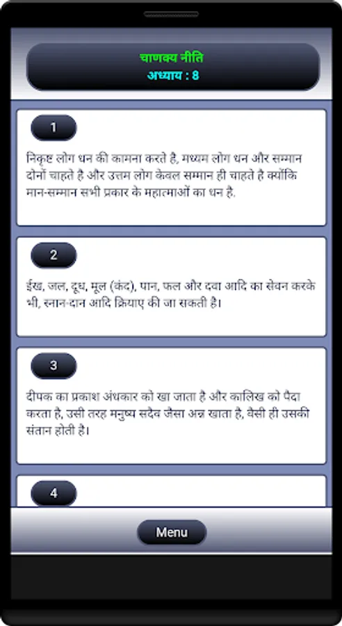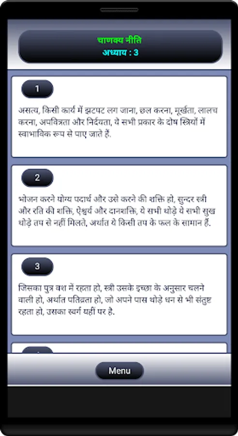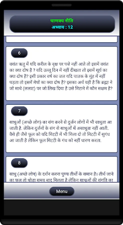 We have included all neeti vachan included in Chankya Neeti (Chanaky niti), some of them might not be applicable to us, please bear with them. We are not taking responsibilities on this historical content. Please don't get offended with them.