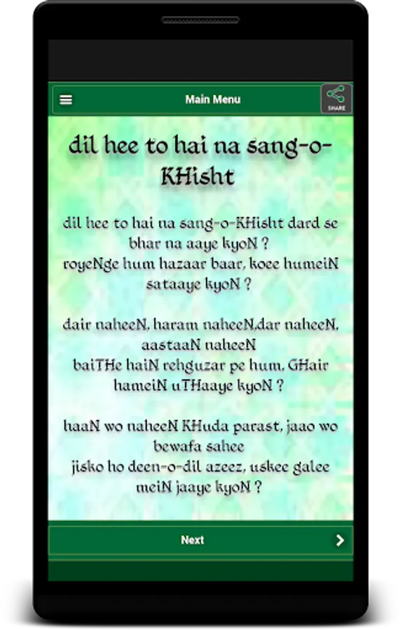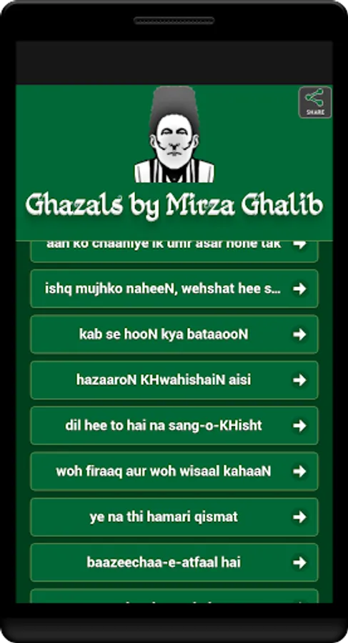 For true lovers of Ghazals and Urdu Poetry / Hindi poetry, a must have gazal app for all Mirza Ghalib (Galib / Gaalib) fans.