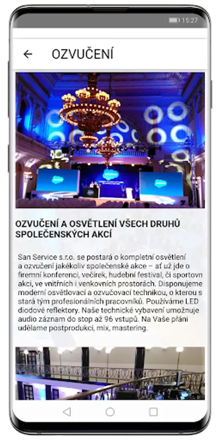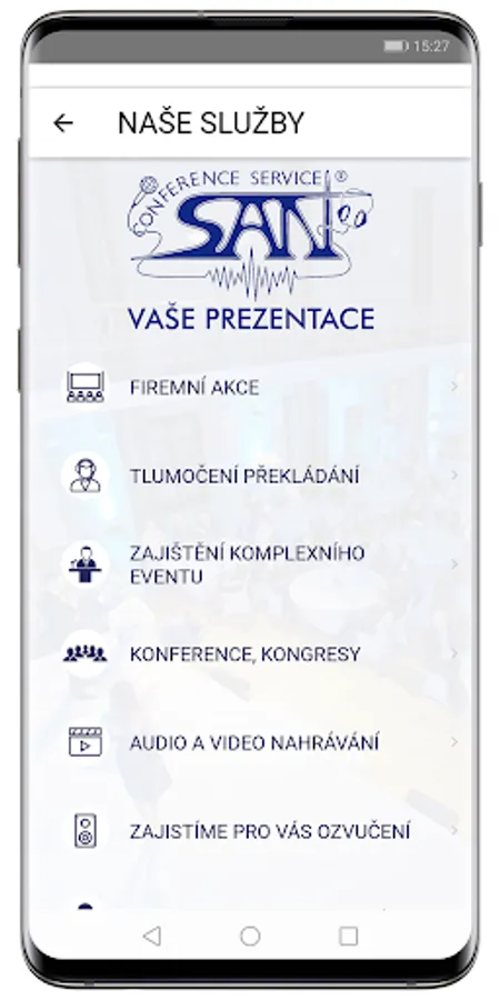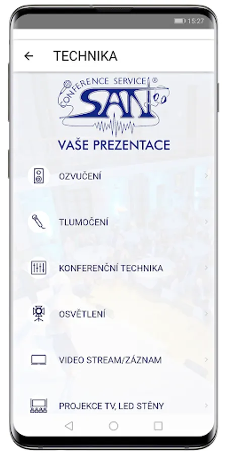 SAN SERVICE, sro provides interpreting, sound and catering services. We rent sound systems, audio, video and projection equipment, computers, stages and voting equipment. We provide translation and interpreting.Postaráme technical and catering service congress, corporate presentations, parties, seminars, training or press conferences. Rental of videos, projection equipment and lighting. Technical and personnel equipment of events.