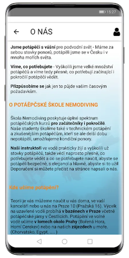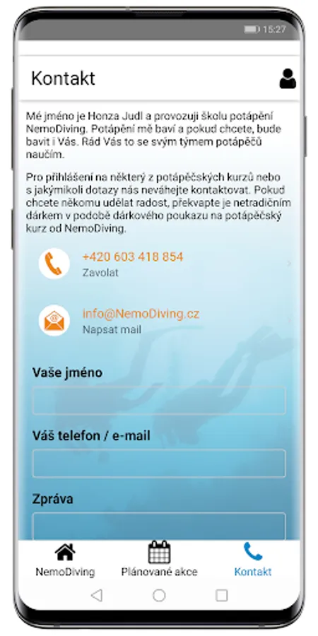 NemoDiving. The clever NemoDiving application will help you choose the dive course whether you are a beginner or an advanced diver. In the app you will find a lot of useful information from first aid, diving signals, ... to a list of things that a diver should always have with him.
