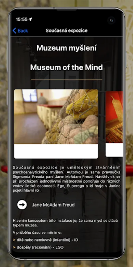 The current exhibition is an artistic representation of psychoanalytic thinking. The author is the great-granddaughter of Sigmund Freud, Mrs. Jane McAdam Freud. The visitor immerses himself in various layers of human personality as he walks through the individual rooms. Ego, Superego and Id play a major role in Janine's conception.