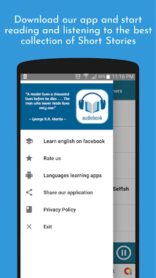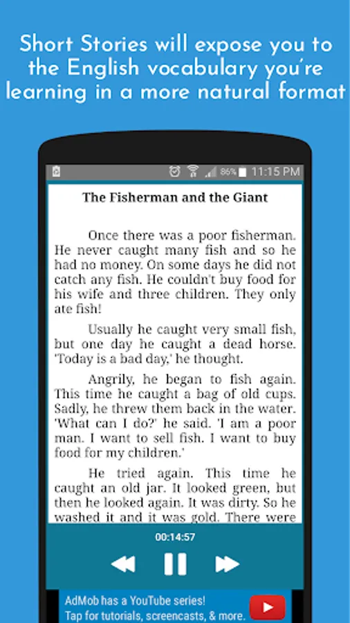 • You can focus more on ideas and concepts. Language is less about words and more about the meaning behind them. If you spend all your time learning vocabulary and grammar, you will never be able to fluently speak a language because you will have little to talk about. These short stories give you the opportunity to understand big ideas in context. Our app contains : english story, short moral stories in english, fairy tales story in english, english grammar lessons for beginners, vocabulary words to english learn, free audiobooks, english story for learning, small story in english.