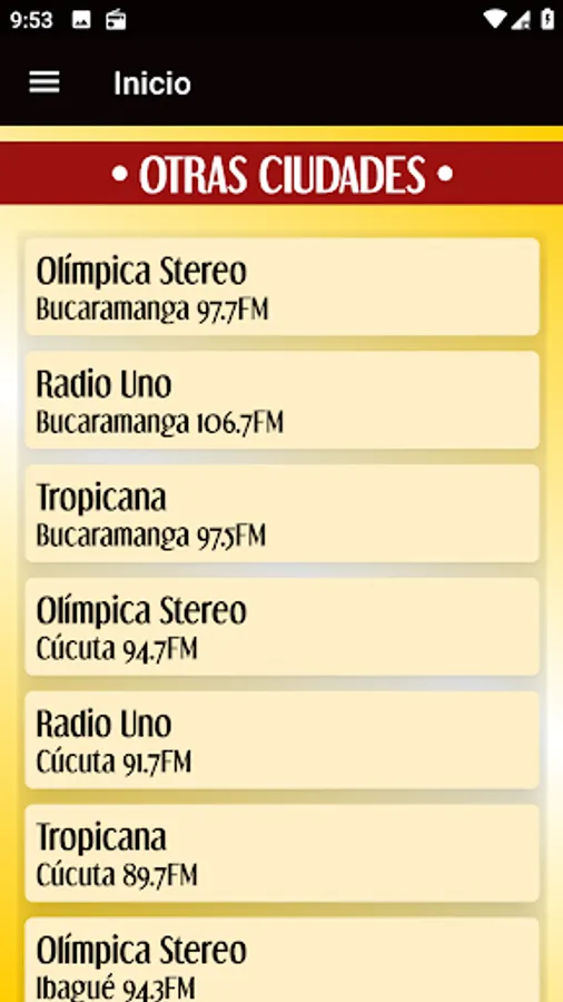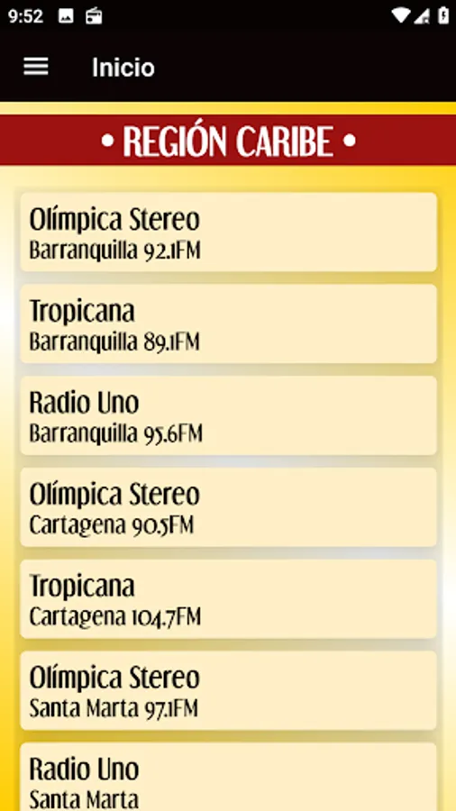 The stations Olímpica Stereo de Medellín 104.9fm, Bogotá 105.9fm, Cali 104.5fm, Barranquilla 92.1fm, Cartagena 90.5fm, Santa Marta 97.1fm, Sincelejo 101.5fm, Valledupar 93.7fm, Montería 90.5fm, Pereira 102.7fm, Armenia 96.1fm, Manizales 89.7fm, Bucaramanga 97.7fm, Cúcuta 94.7fm, Ibagué 94.3fm, Neiva 100.3fm, Villavicencio 105.3fm.