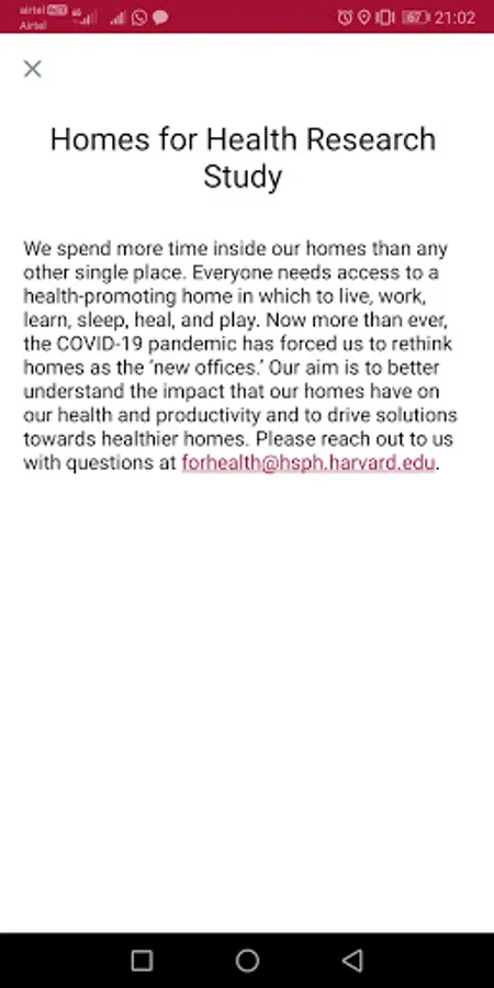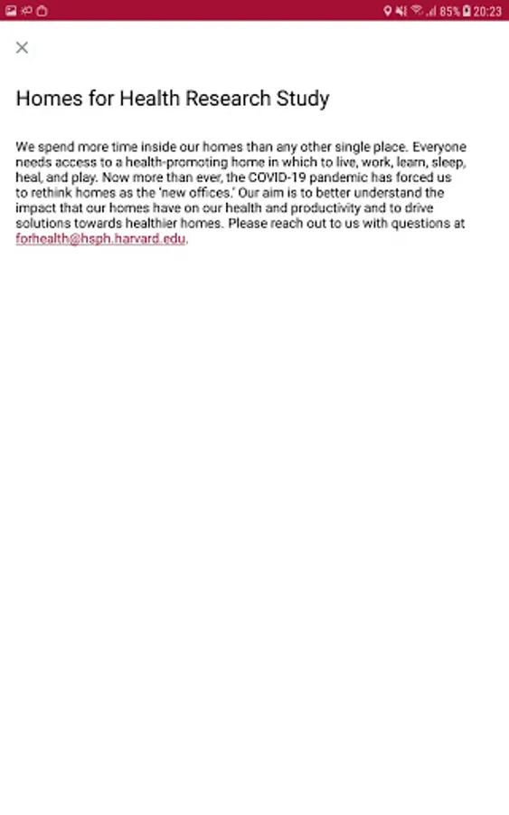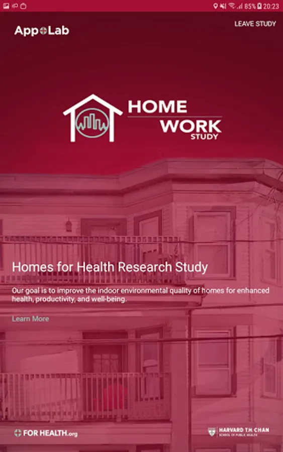 The Home/Work Study app was designed using AppLab as the data collection tool for the Harvard Home/Work Study, a research project looking at the impacts of our homes on health and productivity. The app administers a series of health and wellbeing surveys to allow remote participation and engagement. In addition to administering surveys, the app provides a dashboard to track participants' progress. If you would like to learn more about the study or are interested in participating, please contact forhealth@hsph.harvard.edu