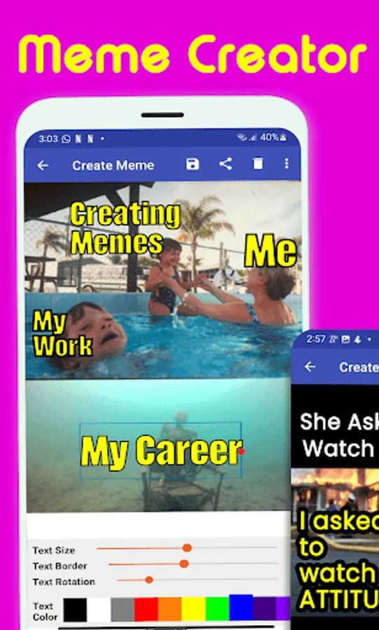 With Meme maker you can create the funniest memes and share them with your friends via Facebook, Twitter, Instagram, Google+, E-mail, Dropbox,...