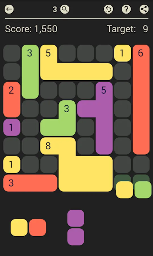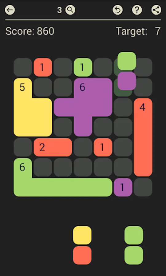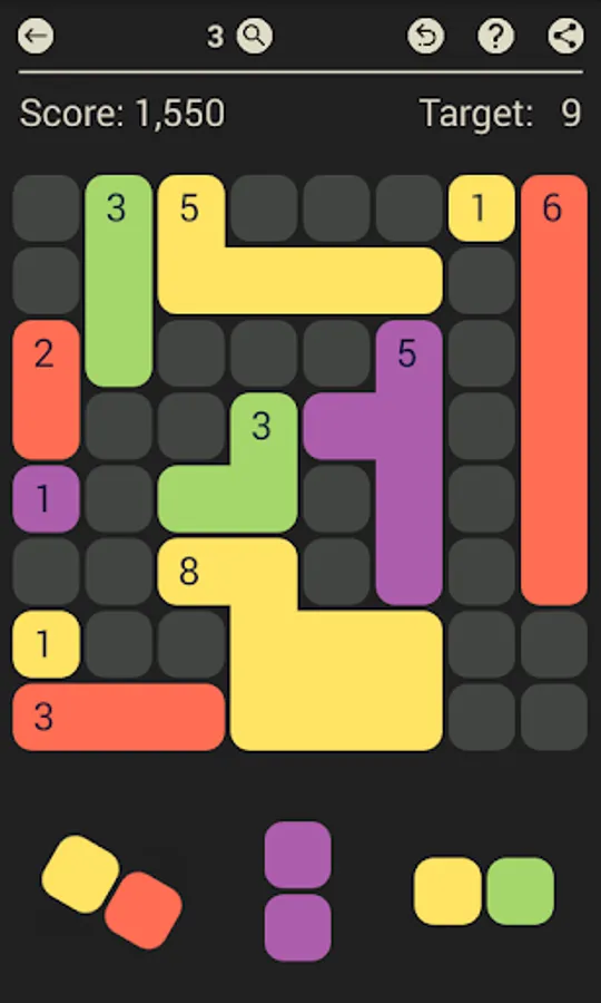 ✔ 3 game modes: select a fixed area target (7 or 9), or spice a bit the game with the challenge game mode. In the challenge one, the area target increases regularly... but surely.