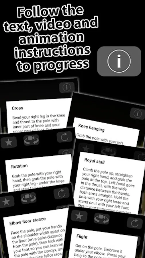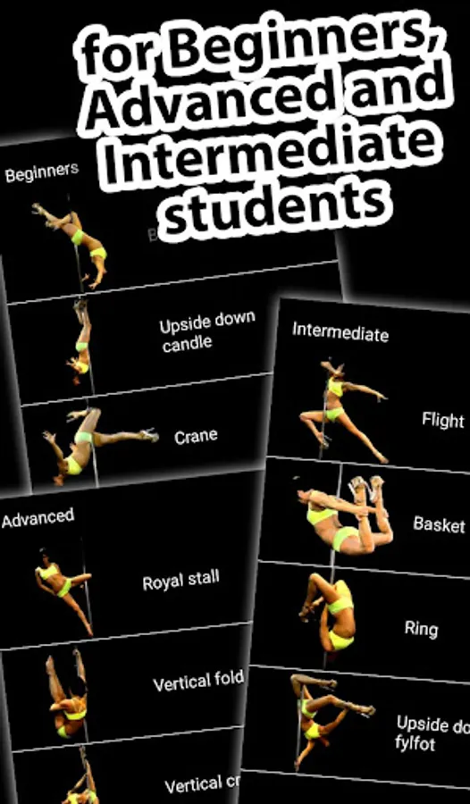 This app will help you to study Pole Dance moves by showing them from different perspective (POV: side and top) with audio and text descriptions.