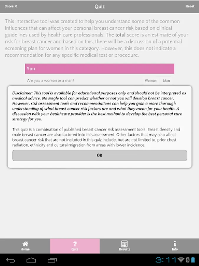 My Breast Friend is here to help you understand your risk for developing breast cancer by incorporating well-known risk factors and making it your own personal tool. It includes the newly popularized breast density as well as discusses breast implants and male breast cancer. Once your risk has been calculated it gives possible recommendations that may be made by your health care provider enabling you to ask questions before your appointment.