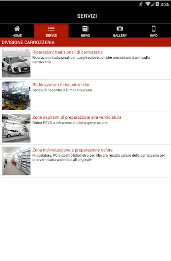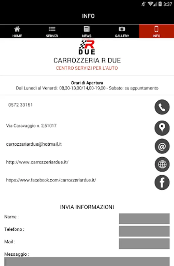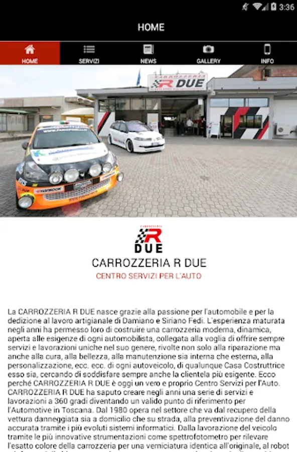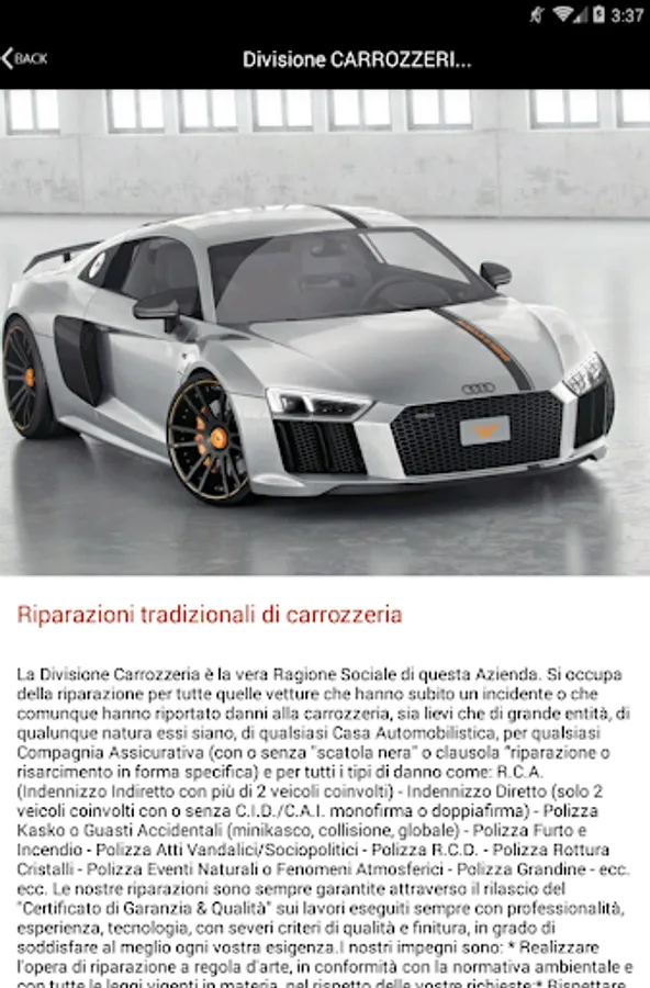 This is the official APP of R TWO BODY. Through this app you will receive, in case of accident, some free services dedicated to you, such as "Customer Care", "Legal Assistance", "Breakdown", "Auto Substitute" as well as quotes, tips and information of various usually as a result of an accident or just for the care or customizing your car. You can also consult and be up to date on all of our many, different, special and unique processes and services we offer, various information, advice and curiosity, constantly monitoring all of our contacts also in case of emergency. The BODY DUE R consists of several Divisions, because of the many exclusive processes that we can play and also offer to that part of the most demanding customers. We recommend, however, not to think that we are the phenomena or, even worse, that