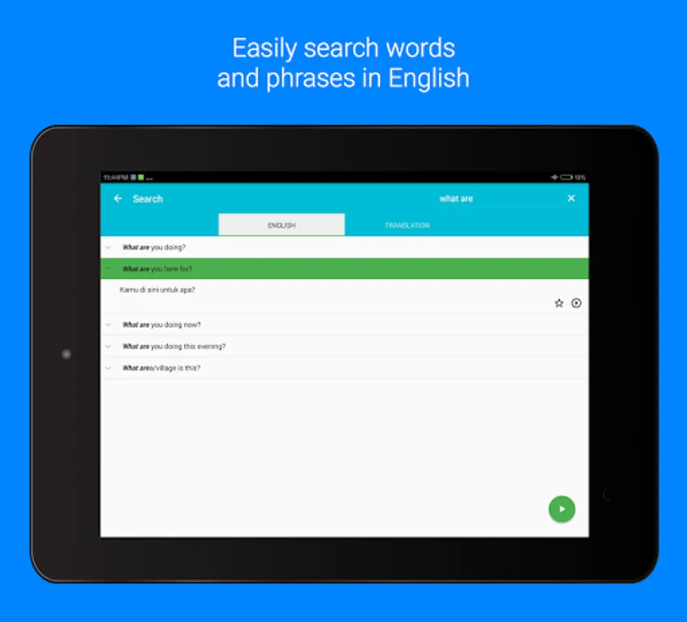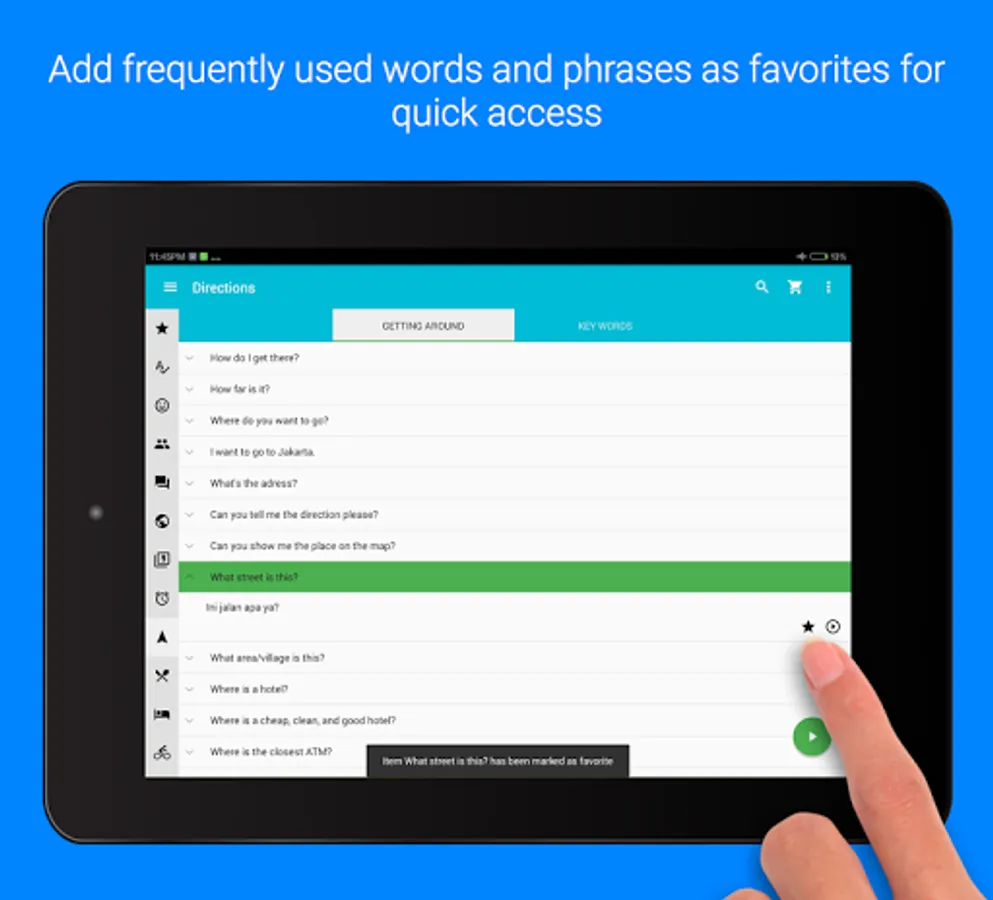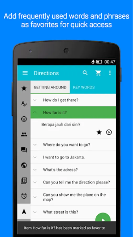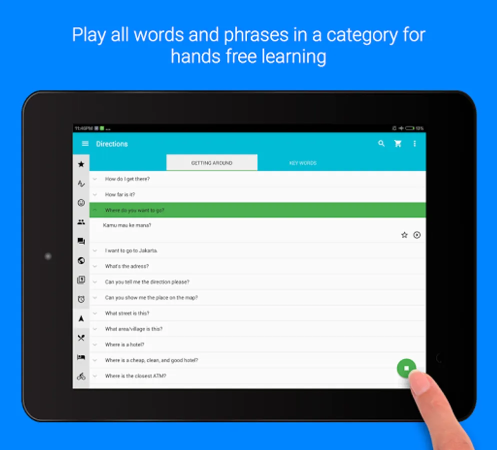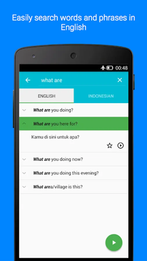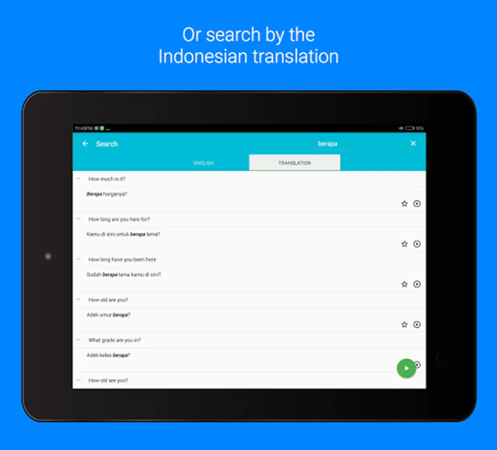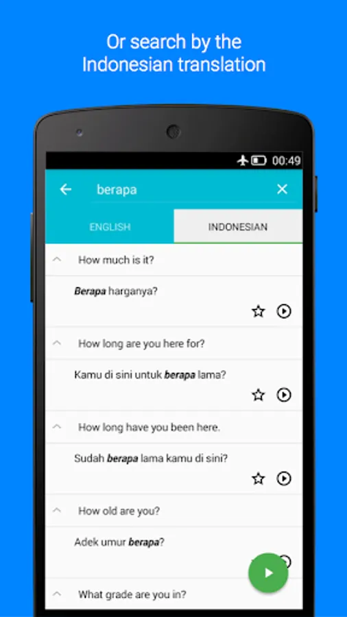 This app can also act as a handy Indonesian phrasebook for your quick reference whether you are travelling to Indonesia, staying in Indonesia or you just want to impress your Indonesian friends.