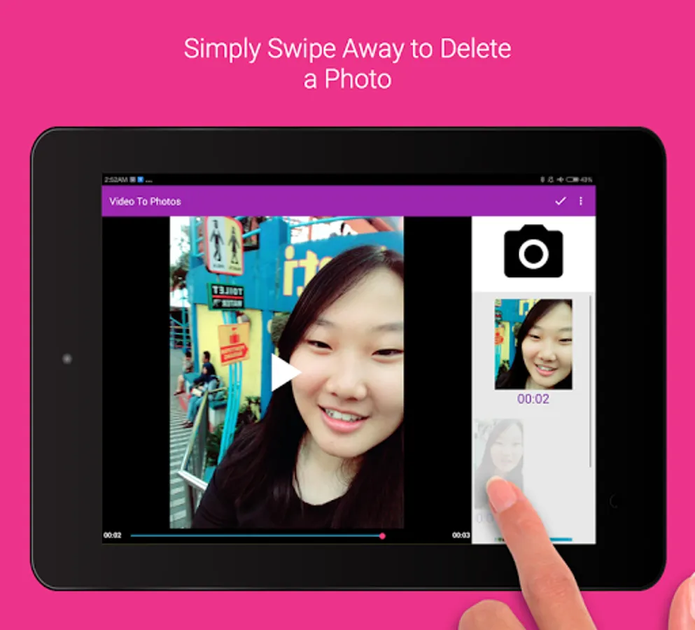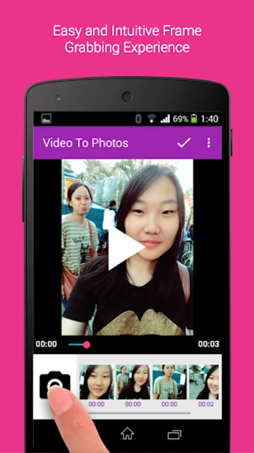 Video to Photo Frame Grabber is the best way to grab/capture photo from your video. The process is simple and intuitive; you just need to play a video right from the app, do video frame capture at your desired times, and you can snap multiple pictures, once you're done, finish your capturing session. Upon finishing, you will be prompted to open the captured images on your phone gallery.