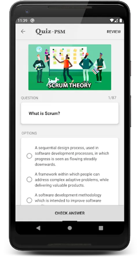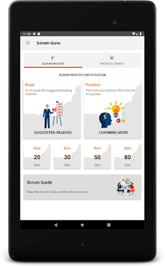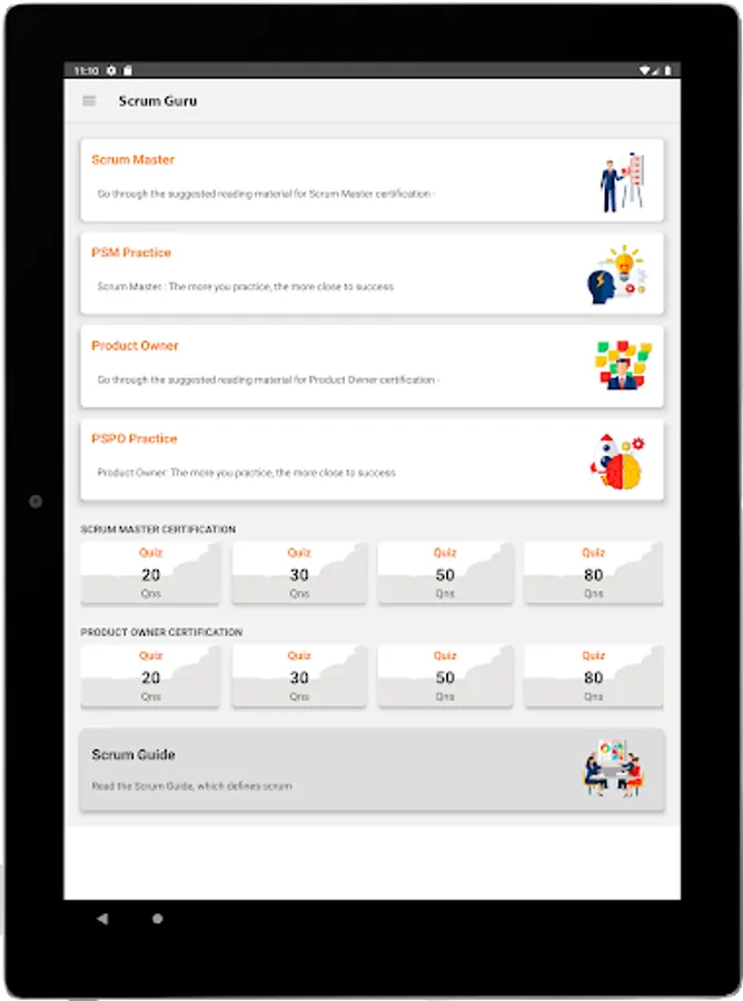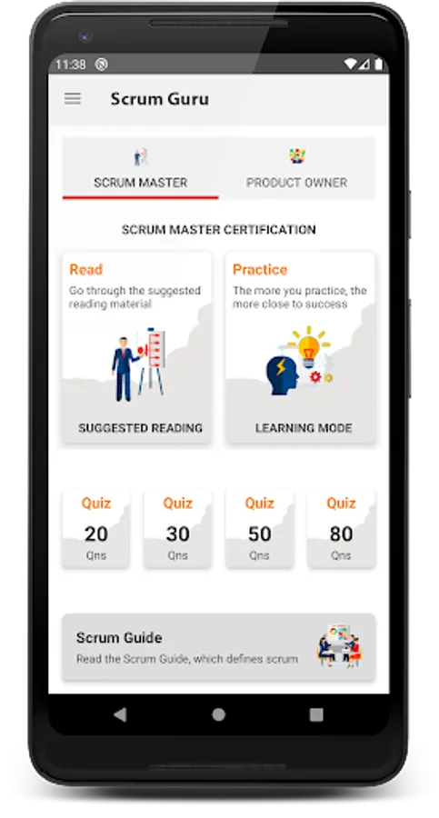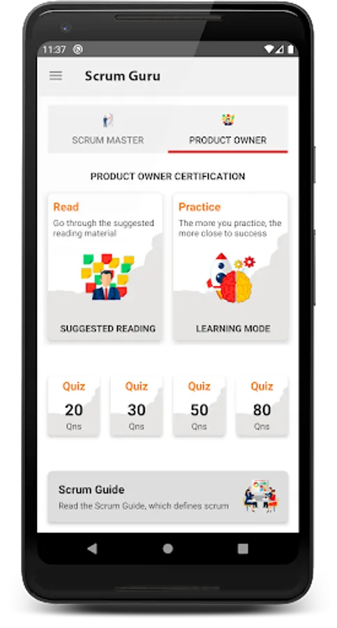 Scrum Guru is an innovative app in which helps your through your journey to earn your coveted Agile Scrum certification like CSM or PSM or PSPO or CSPO.