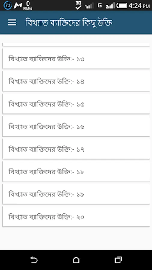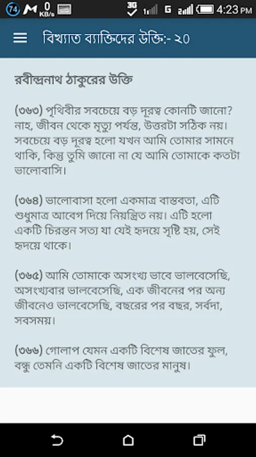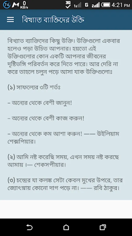 Bangla quotes app is a fantastic android app for read bangla quotes and share with friends facebook status. Everyday you can share bangla quotation status. We added all motivational quotes bangla in this app. From this quotes bangla app you can learn thousand of bangla famous quotes. We also add quotes bangla love for every lovers, lovers can read loves quotes and send love bangla quotes to each other. You must read onupreronamulok ukti to follow bangla famous people footprint.