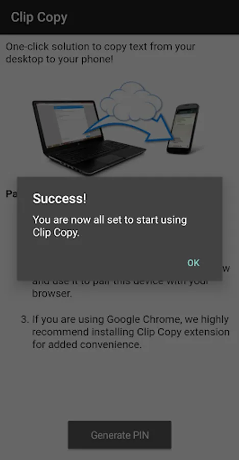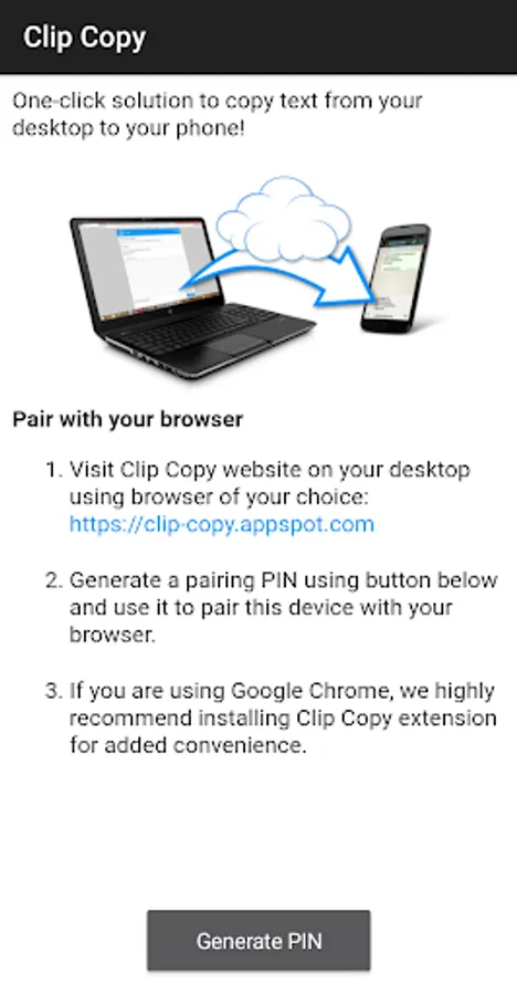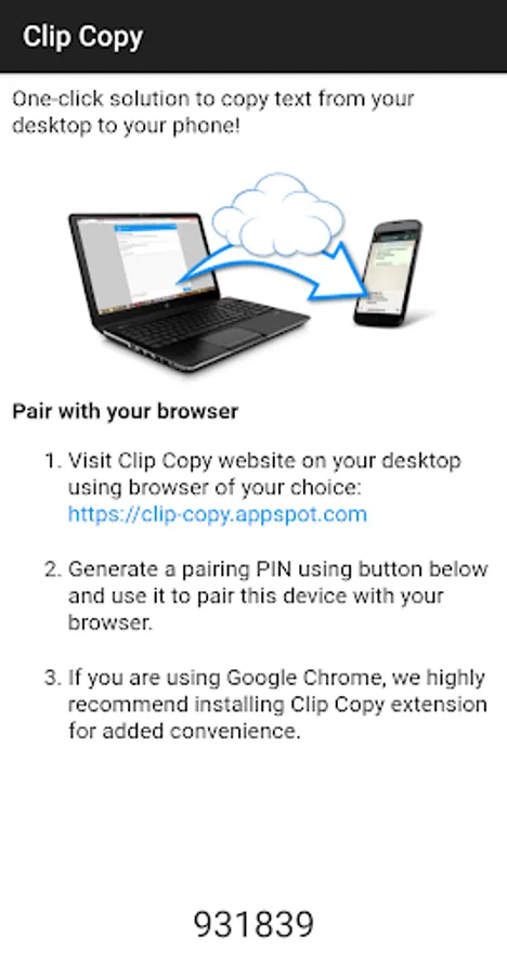 To get started, visit https://clip-copy.appspot.com from your desktop and follow easy to understand instructions.