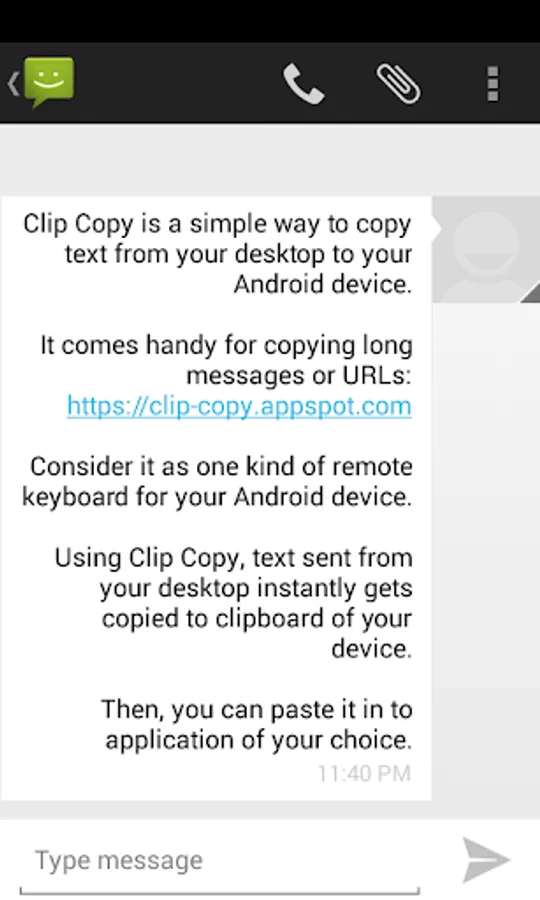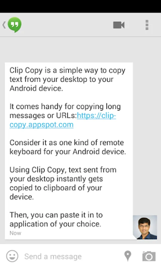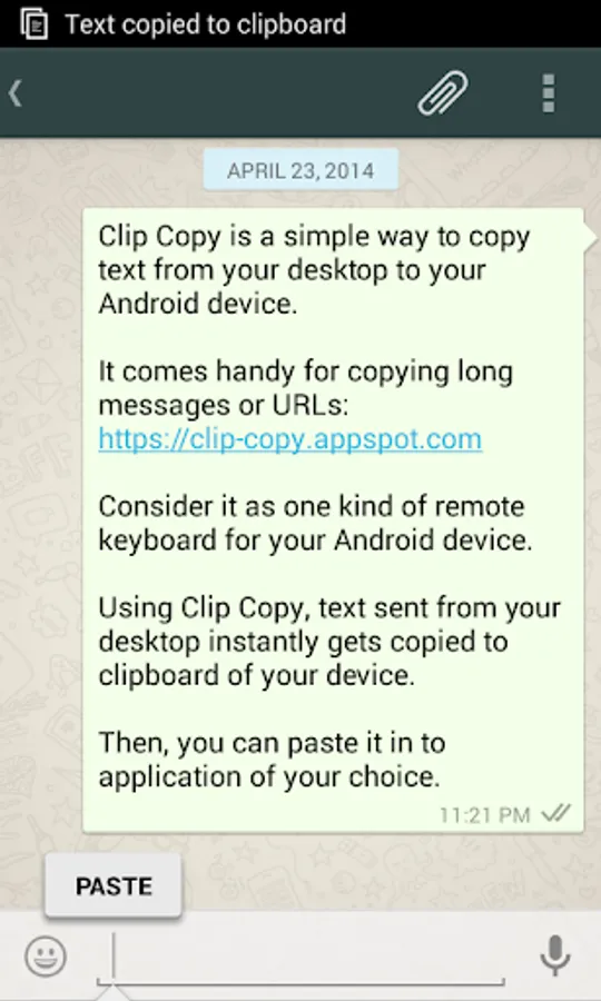 Text sent using Clip Copy instantly gets copied to clipboard of your device. Then, you can paste it in to application of your choice to use it further.