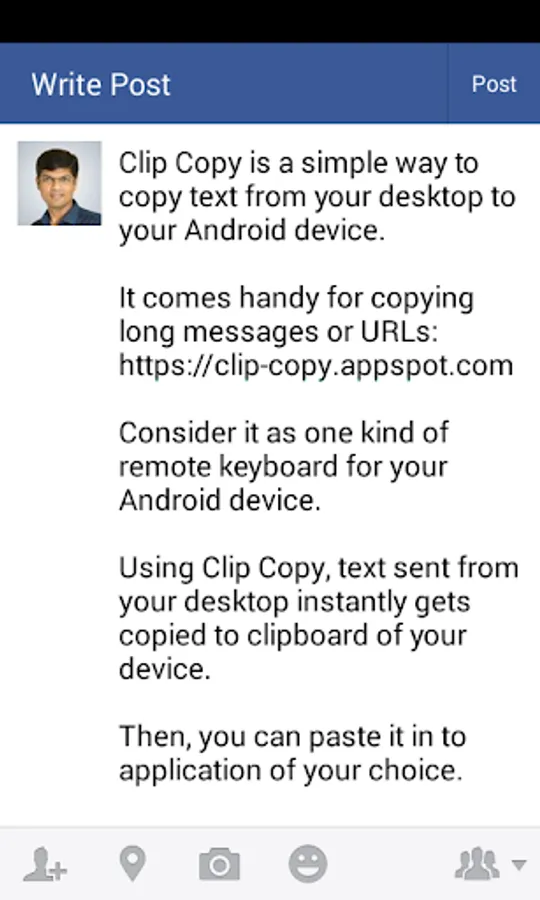 Clip Copy is a simple way to send text from your desktop to your Android device. It comes handy for sharing long messages or URLs. Consider it as one kind of remote keyboard for your Android device.