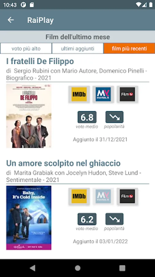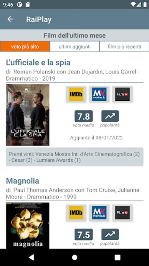 Find out which are the best movies to see . For each film, the average rating is calculated based on ratings from IMDB, MyMovies and FilmTV sites. There are links to the original sites that you can visit to get more information about the film and to read the reviews.