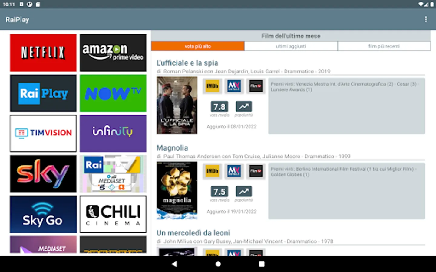 This App does not allow you to watch movies but is used to find out which are the best movies that can be seen on TV and on the main streaming channels.