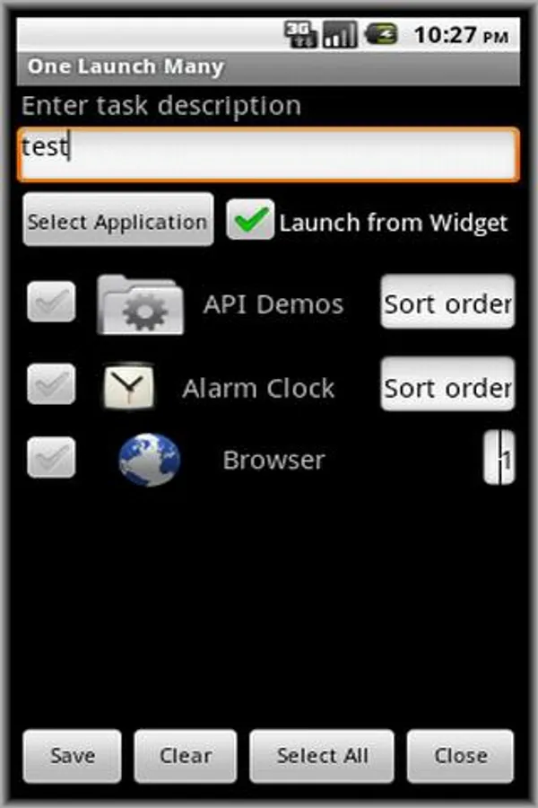 To configure, tap New Task, enter a task description, tap Select Applications to add those apps you always want to launch them together. Check the Launch from widget checkbox. Tap Save. Tap Exit.