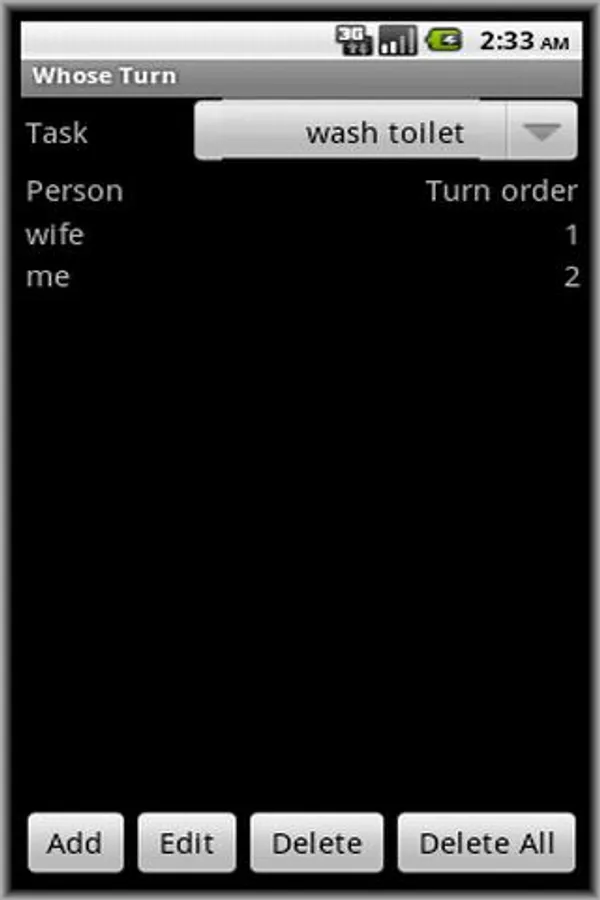 To use, at Home screen long tap Widgets -> Whose Turn. A screen appear for you to select a task. Once selected, a widget will show the task current person responsible is who. Upon tapping the widget, a screen appear and you can see the other person turn order. Tap Next Round to rotate the next person in queue to the first. This is crucial else the person turn order is NOT changed.