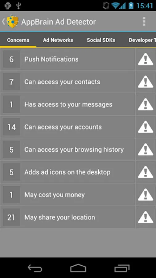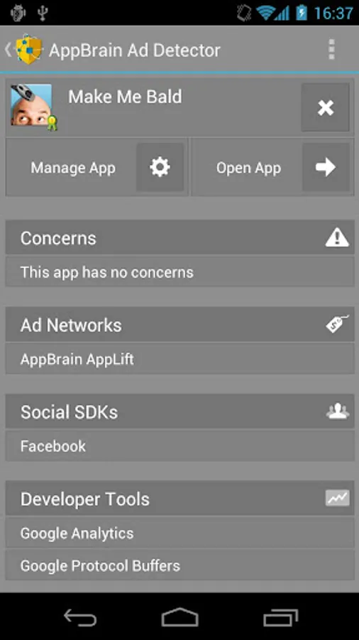 - Developer Tools; detect libraries like Google Analytics, Flurry Analytics, Google Play in-app billing, Android support library, ACRA, Phonegap, and many more.