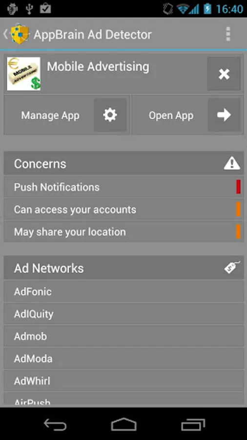 - Android Ad Networks; this app tells you which ad networks are embedded in apps, such as Admob, Millennial Media, ChartBoost, TapJoy and many smaller ones. Indicates which ones may have push ads.