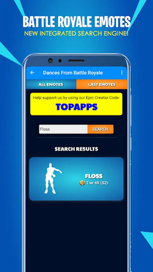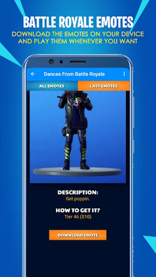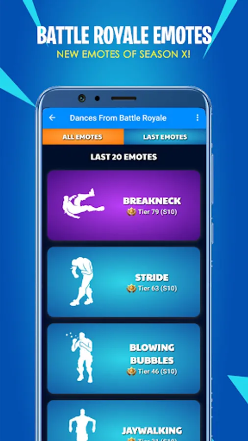 In this application you can find all the Battle Royale Emotes. If you are a lover of this game No. 1 of the moment, this App must be installed on your Android device. We have all the Emotes and Gestures updated every day, with emotes of the NEW Season. Learn to dance them all and become the envy of all your squadron.