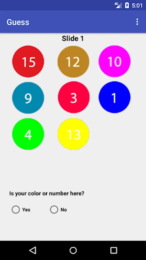 You will show them 5 screens asking whether the color/ number they chose is shown on them or not. The answer should be yes or no. After you press yes or no on all screens the answer will be shown on the result screen.