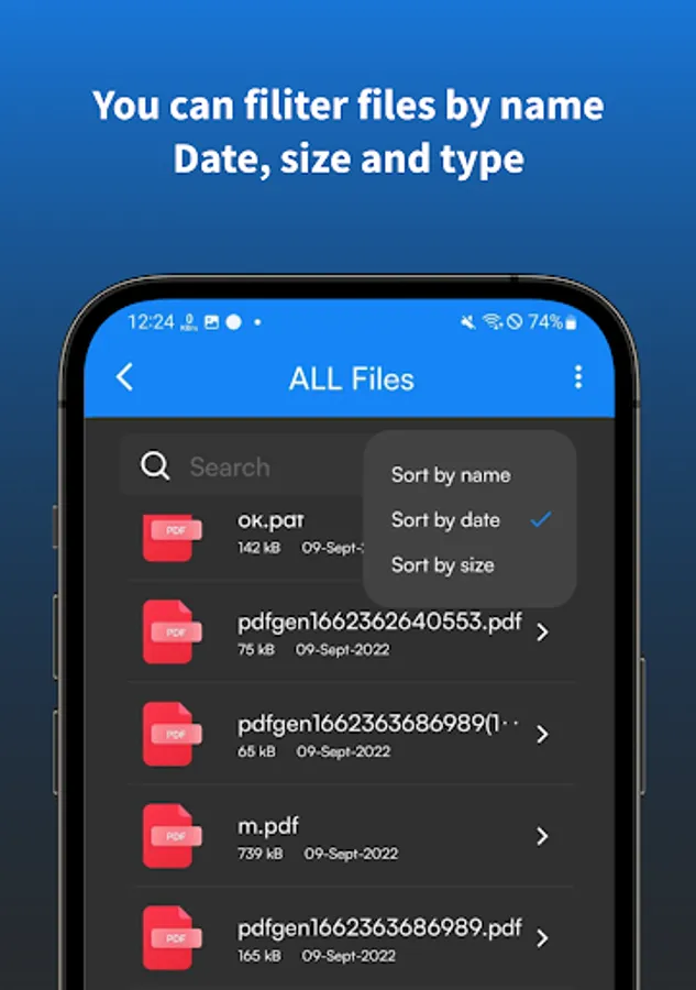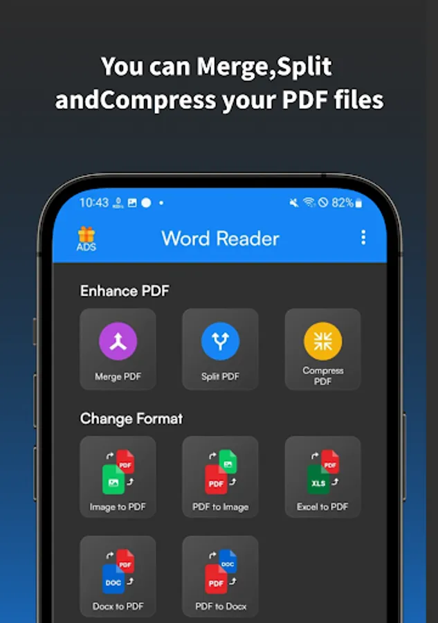 Docx File Reader app supports PD F format as well. The app has a feature to view PDF files using PDF file reader feature. PDF Files screen lists all the pdf files stored in the storage of smart phone. User may easily view manage and share PDF files.