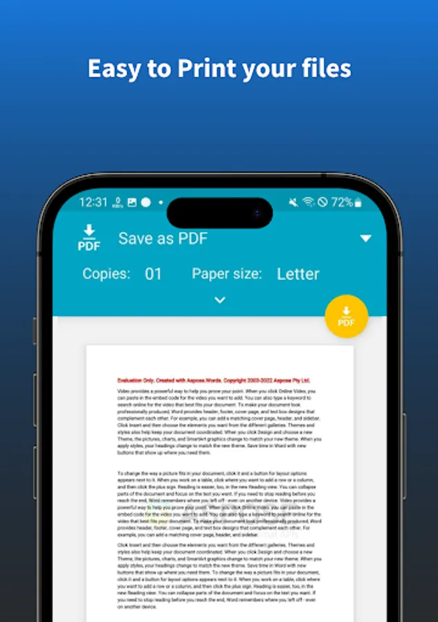 Document Printing: Printing document is made easy for its users. You may directly tap on Print button to print docx file. Connect your device with printer via wifi or bluetooth to start print documents.