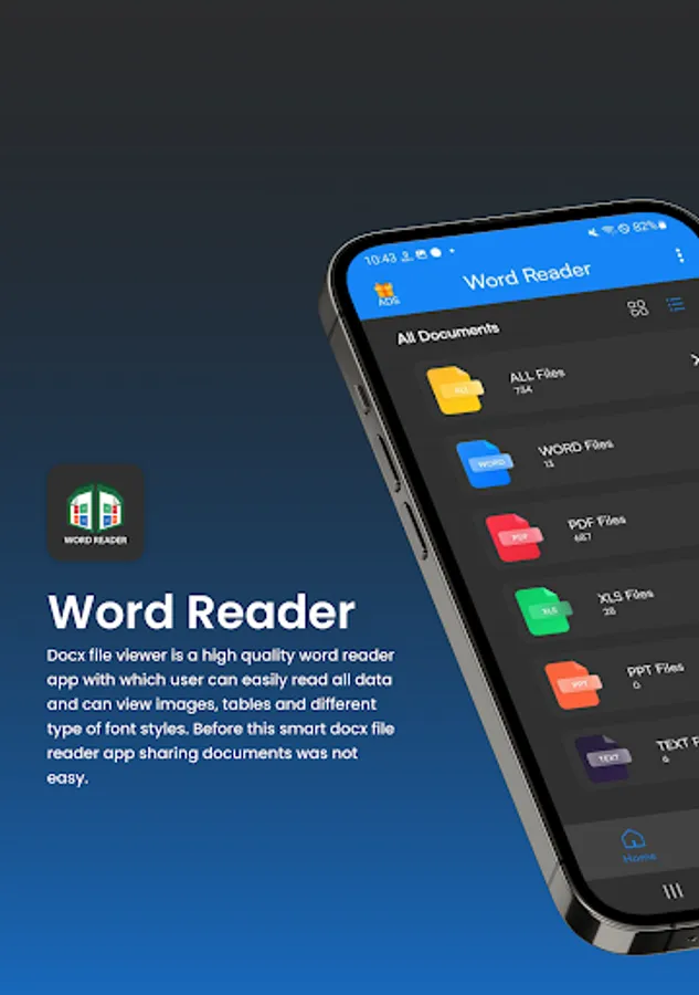 Docx File Reader - Word Document Office Reader & Viewer is an app that works like all file reader app and supports many formats such as “docx, doc, xlsx, pptx, txt & PDF ”. This simple and smart document reader app can help user to view word documents on smart phone. You can browse through all of your word file documents and easily view all docx file with a single tap on it.