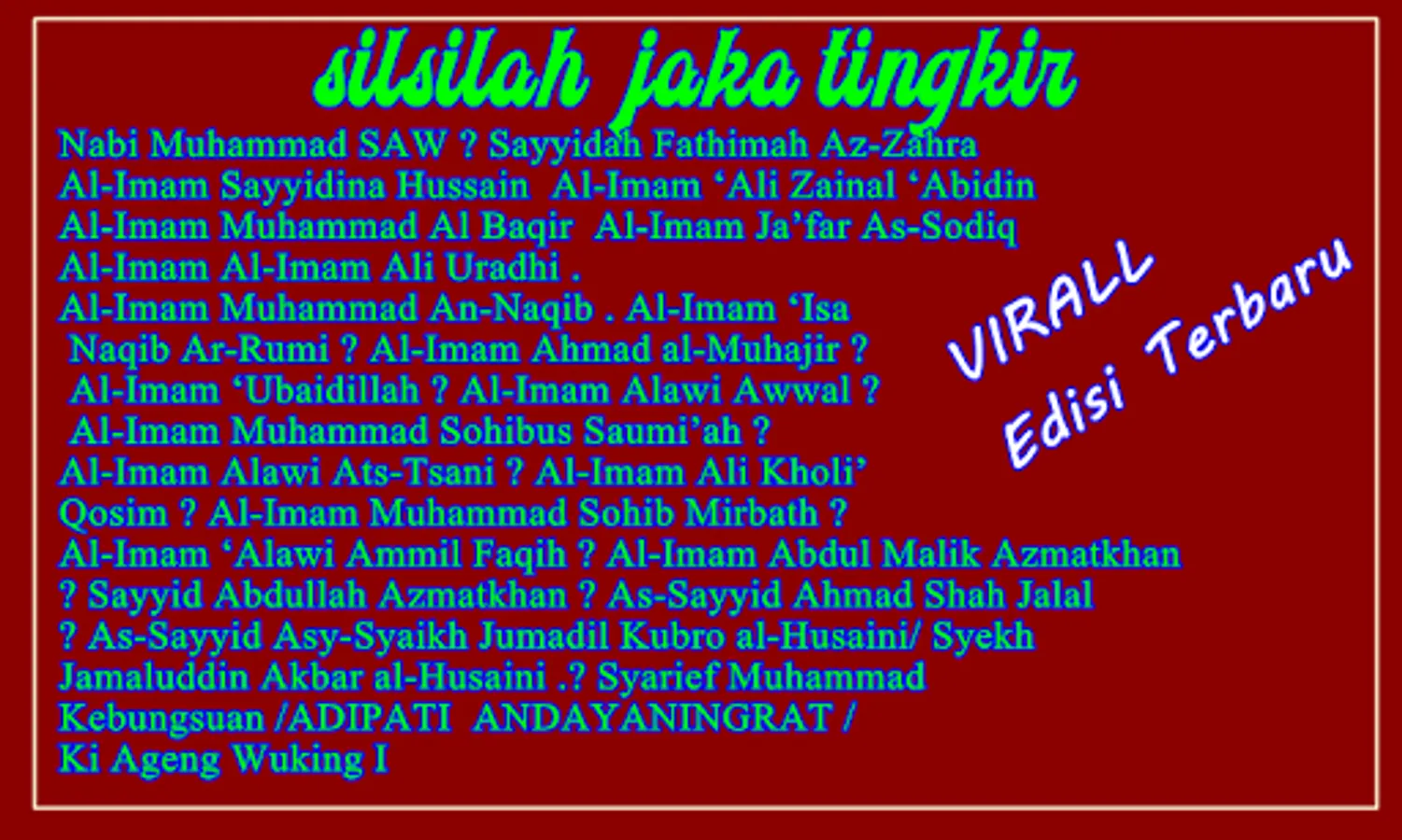 Jaka's genealogy of moving away and his Nasab as the 23rd Grandson of the Prophet Muhammad - Jaka Tingkir is a son of Kebo Kenanga and grandson of Adipati Andayaningrat. Adipati Andayaningrat is also known as 'Syarief Muhammad Kebungsuan'. A little about the history of the life of Jaka Tingkir, namely when Jaka Tingkir was born, his father was holding a wayang beber performance in which the mastermind was Ki Ageng Tingkir. The second Ki Ageng is none other than the student of Sheikh Siti Jenar. After being the mastermind in the event, Ki Ageng Tingkir fell ill and died.